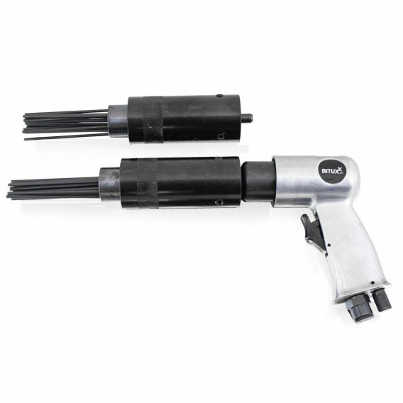 Profesjonalny, pneumatyczny młotek igłowy niezastąpiony w większości prac związanych z obróbką metalu. Młotek igłowy przeznaczony do ciągłej, wymagającej pracy, do usuwania rdzy, kamienia kotłowego, zgorzelin, nagarów, starych powłok lakierniczych z powierzchni metalowych. Dziewiętnaście niezależnie poruszających się igieł umożliwia dotarcie w trudno dostępne miejsca dostosowując się do obiektów zniekształconych i nieregularnych, czyszcząc obrabiany materiał w klika sekund.