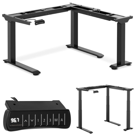 Stelaż biurka narożnego marki Fromm & Starck z regulacją wysokości umożliwia zarówno pracę w pozycji siedzącej, jak i stojącej. Stelaż do biurka można regulować na wysokość 600-1250 mm oraz zmieniać szerokość powierzchni roboczych od 900 do 1500 mm (prawa) lub od 1100 do 1900 cm (lewa). Blaty ustawione zostały pod kątem 90°. Trzy kolumny podnoszące są regulowane cicho, delikatnie i szybko (38 mm/s) za pomocą 3 silników o mocy 450 W. Sterowanie odbywa się intuicyjnie. Dzięki funkcji pamięci można zapisać do 3 ustawień wysokości i w razie potrzeby szybko je przywołać. Praktyczna rama została wyposażona też w timer, który przypomina o przerwie lub konieczności zmiany pozycji. Konstrukcja wykonana ze stali z elementami wykonanymi z wysokiej jakości tworzywa sztucznego. Gumowe nóżki zapobiegają ślizganiu się i chronią podłogę przed zarysowaniami.