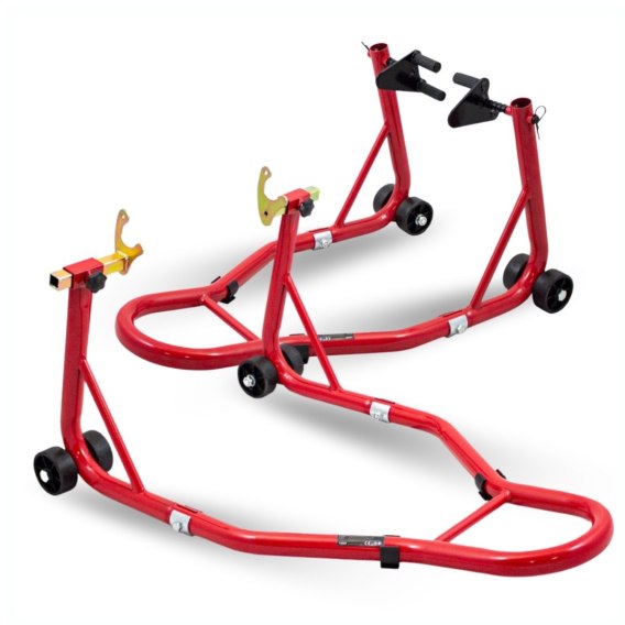 Stojaki motocyklowe na przód i tył czerwone stalowe 250 kg regulowane