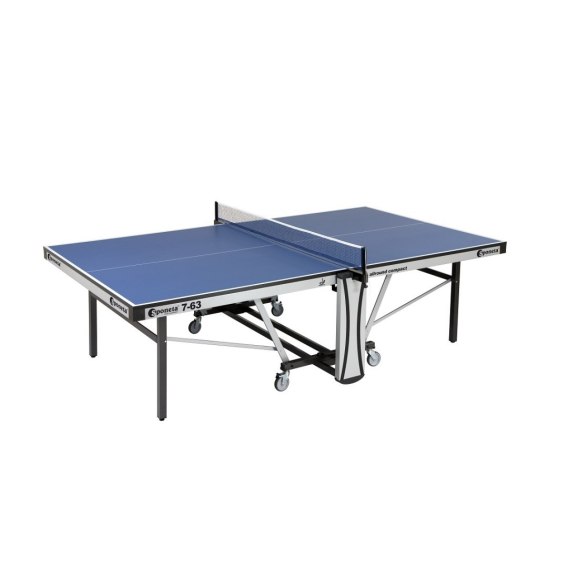 Stół turniejowy do tenisa stołowego SPONETA S7-63i do użytku wewnątrz pomieszczeń. Stół wyposażony jest w kółka ułatwiające obsługę po złożeniu, z czego 2 kółka są zabezpieczone przed przesuwaniem. Stół do tenisa stołowego SPONETA S7-63i jest w komplecie z uchwytem na siatkę i siatką.