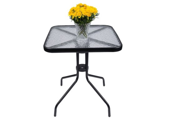 Solidna stalowa konstrukcja ze szklanym blatem doskonale wpasuje się w niewielkie przestrzenie. Stolik doskonale sprawdzi się na balkonie, tarasie czy też w ogrodzie. Stół posiada cztery stabilne nogi, wykonane z materiałów odpornych na warunki atmosferyczne.