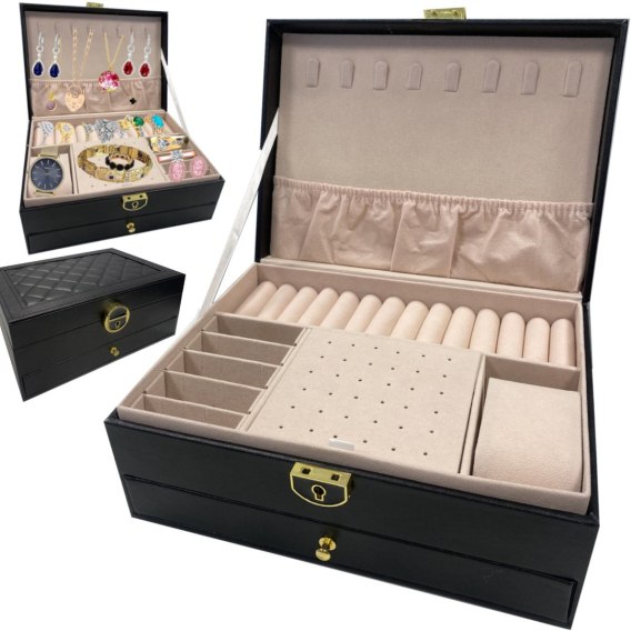 Szkatułka kuferek organizer na biżuterię zamykany na klucz - czarna