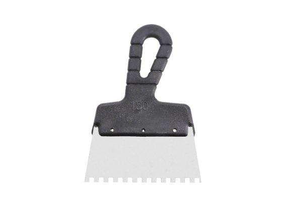 Szpachla trapezowa zębata M7 o szerokości 15 cm - narzędzie to idealnie sprawdza się w precyzyjnym nakładaniu klejów, zarówno tych przeznaczonych do prac wewnętrznych jak i zewnętrznych, a także zapraw klejowych i mas montażowych