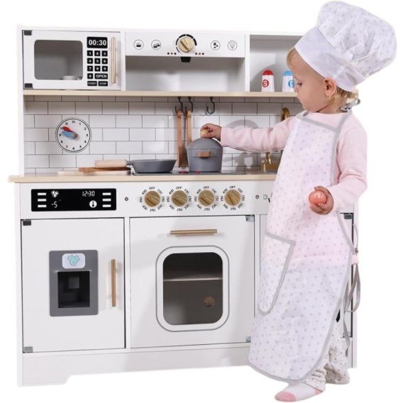 Drewniananowoczesna kuchnia od Tooky Toy to ponadczasowa i ulubiona zabawka dla dzieci powyżej 3 roku życia, która przeniesie je w świat gotowania. Kuchnia kompletnie wyposażona w akcesoria i urządzenia, stymulujące prawdziwą kuchnię, co sprawia, że idealnie nadaje się do zabawy w odgrywanie ról, pozwalając dzieciom na naśladowanie codziennego życia dorosłych. Zabawa drewnianą kuchnią od Tooky Toy nie tylko dostarcza radości i rozrywki, ale także rozwija wyobraźnię, koordynację ruchową i umiejętności społeczne dziecka. To kompleksowe doświadczenie, które połączone jest z edukacją i kreatywnością, stymulując rozwój maluchów na wielu płaszczyznach. Drewniana konstrukcja kuchni gwarantuje trwałość i estetykę, a dodatkowo zapewnia realistyczne wrażenia podczas zabawy.