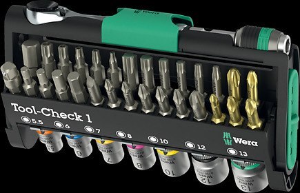 Zestaw 38-częściowy. Bardzo kompaktowy zestaw narzędzi do obsługi ręcznej i maszynowej. Elementy blokujące Tool-Check w kolorze zielonym zabezpieczają narzędzia podczas transportu. W zestawie grzechotka do bitów 1/4", kuta matrycowo, stalowa. Drobnozębny mechanizm zapadkowy z 60 zębami zapewnia niewielki kąt powrotu zapadki 6° umożliwiając precyzyjną pracę. Łatwe przełączanie kierunku pracy w prawo i w lewo. Ergonomicznie ukształtowana główka grzechotki i dźwignia. Dzięki dołączonemu do zestawu adapterowi Wera 870/1 (z sześciokąta 1/4" na czworokąt 1/4") możliwe jest również stosowanie kluczy nasadowych 1/4". 7 kluczy nasadowych Zyklop (1/4", do obsługi ręcznej i maszynowej) z rowkiem ustalacza kulkowego. Radełkowanie tylnej części zapewnia dobry chwyt podczas ręcznego dokręcania.