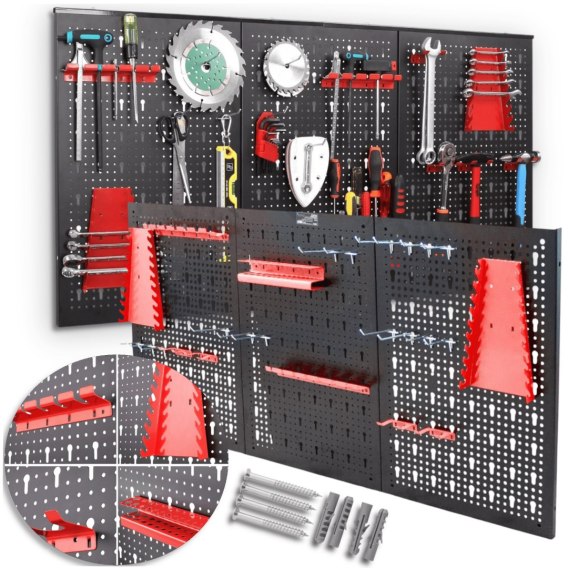 Trzy solidne panele perforowane, 25 uchwytów na narzędzia i stalowa konstrukcja, która pozwala na uporządkowanie przestrzeni roboczej.