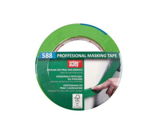 Taśma malarska dla profesjonalistów Scley seria 588 to produkt dedykowany do prac malarskich i ogólnobudowlanych. Przeznaczona jest do maskowania i zabezpieczania powierzchni wewnątrz i na zewnątrz. ochrony listew, okien, drzwi, gniazdek, przełączników oraz wąskich profili. Przystosowana do długotrwałego przebywania na powierzchni wewnątrz budynków (14 dni) i na zewnątrz (5 dni). Bardzo dobrze przykleja się do różnorodnych powierzchni i z łatwością się z nich usuwa nie pozostawiając śladów kleju. Cechuje się odpornością na promieniowanie UV.