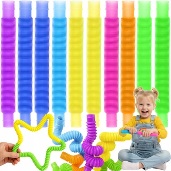 Rurki / tuby sensoryczne POP to zestaw 10 elastycznych, kolorowych rurek, które rozwijają motorykę małą, wyobraźnię przestrzenną i kreatywność u dzieci oraz zapewniają relaks i wyciszenie dorosłym.