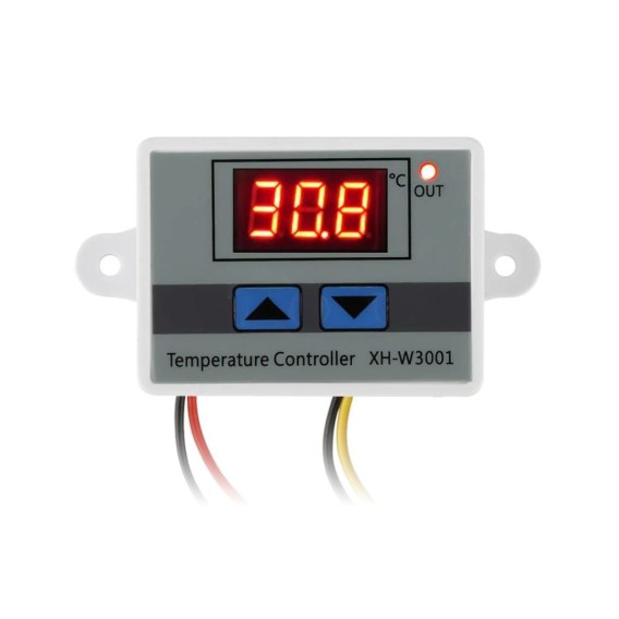 REGULATOR TEMPERATURY TERMOSTAT ELEKTRONICZNY 230V XH-W3001 AC110-230V W3001Regulator temperatury W3001 umożliwia sterowanie różnego rodzaju urządzeniami elektrycznymi takimi jak: pompy CO, pompy wody, pompy cyrkulacyjne itp.Prosty i niezawodny układ do sterownia temperatura. Sterownik może pracować w trybie "chłodzenia" jak i "grzania", co powoduje, iż jest to bardzo uniwersalny układ.Dane techniczne: Napięcie wejściowe (zasilające): AC 110-230V Pomiar temperatury: -50°C - +110°C Maksymalny prąd obciążenia przekaźnika: 1500W Rozdzielczość pomiaru temperatury: 0,1°C (do 99,9°C) Częstotliwość odświeżania temperatury: 0,5s Zastosowany czujnik: NTC10K Sonda pomiaru temperatury: wodoodporna Długość przewodu z sondą: 100cm Długość pozostałych przewodów: 8-10cm Wyświetlacz: LED 3 cyfry Kolor wyświetlacza: czerwony Wymiary obudowy bez mocowań: 60 x 45 x 31 mm Rozstaw otworów w mocowaniach: 73 mmProgramowanie:Ustawienie temperatury włączającej urządzenie podłączonego pod sterownik (start):Należy przytrzymać przycisk ^ przez 3 sekundy aby uruchomić tryb edycji temperatury - ekran powinien zacząć migać. Podczas trybu edycji możemy ustawić żądaną temperaturę za pomocą przycisków ^ i ˇ. Po ustawieniu temperatury nie dotykaj przycisków przez 3 sekundy aby ustawiona temperatura została zapamiętana.Ustawienie temperatury wyłączającej urządzenie podłączonego pod sterownik (stop):Należy przytrzymać przycisk ˇ przez 3 sekundy aby uruchomić tryb edycji temperatury - ekran powinien zacząć migać. Podczas trybu edycji możemy ustawić żądaną temperaturę za pomocą przycisków ^ i ˇ. Po ustawieniu temperatury nie dotykaj przycisków przez 3 sekundy aby ustawiona temperatura została zapamiętana.Aby sprawdzić ustawioną temperaturę załączania (start) lub temperaturę docelową (stop) należy raz przycisnąć przycisk lub .Temperatura załączania ^START niższa niż temperatura wyłączania ˇSTOP - TRYB OGRZEWANIATemperatura załączania ^START wyższa niż temperatura wyłączania ˇSTOP - TRYB CHŁODZENIA.Czerwony przewód: zasilanie (czarny - neutralny).Żółty przewód: odbiornik, którego pracą ma sterować termostat (czarny - neutralny).
