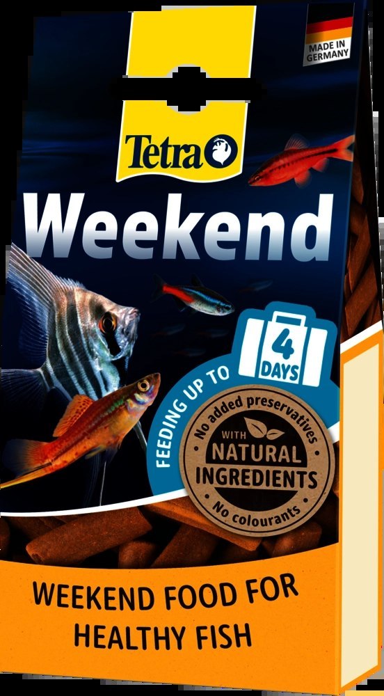 Tetra TetraMin Weekend to pełnowartościowy, kompletny pokarm w formie pałeczek przeznaczony do karmienia ryb ozdobnych podczas weekendów i krótkich wyjazdów wakacyjnych. Zawiera wszystkie substancje odżywcze, witaminy i mikroelementy niezbędne dla dobrej kondycji ryb. Bogaty w proteiny, minerały i podstawowe aminokwasy zapewnia rybom pożywienie podczas nawet 6-dniowej nieobecności opiekunów. Nie pleśnieje, więc nie powoduje zmętnienia wody. Dostępny w formie dużych pałeczek łatwych do dozowania w zależności od wielkości akwarium i liczby ryb.