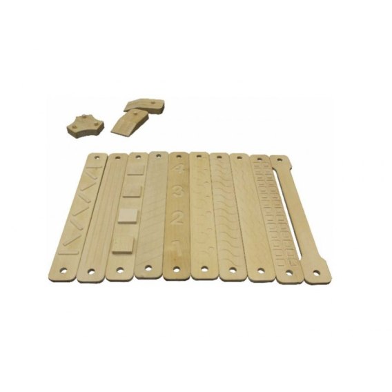 Dziecko może również rozwinąć swój zmysł dotyku, ponieważ deseczki posiadają wycięte różne wzory i kształty, które chodząc boso, dzieci mogą odczuwać na swoich stópkach. Mogą zgadywać na jakim wzorku stoją w danym momencie, co jeszcze bardziej urozmaici zabawę.