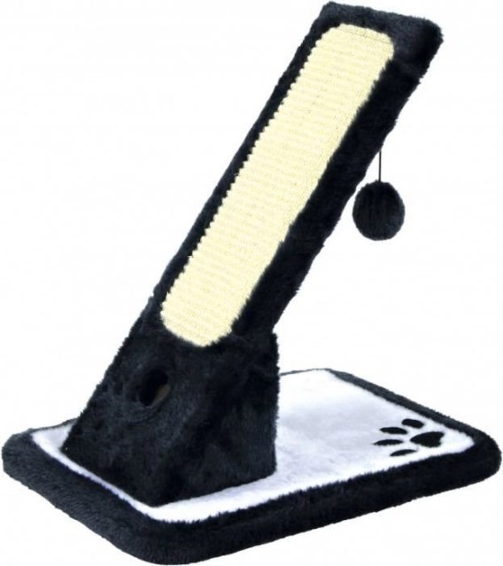 Drapak stojący na podstawie z piłeczką dla kotów w kolorze czarno- kremowym. Wymiary 30x42x40cm.