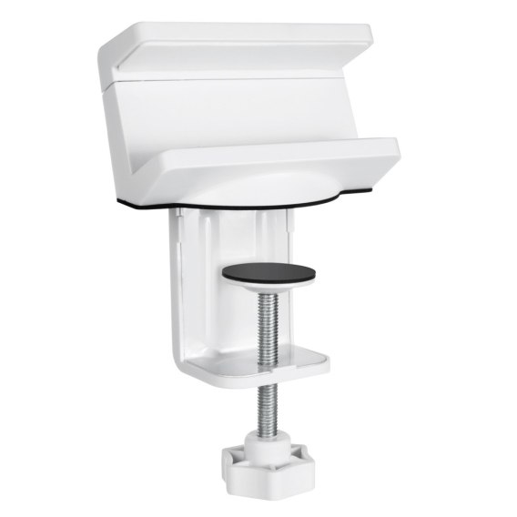 Uchwyt można zamocować do blatu biurka, stołu, itp. o grubości krawędzi od 10 do 55 mm i jest kompatybilny z większością listew o szerokości od 40 do 60 mm. Znajdująca się z tyłu uchwytu przelotka na przewody ułatwia organizację kabli podłączonych urządzeń.