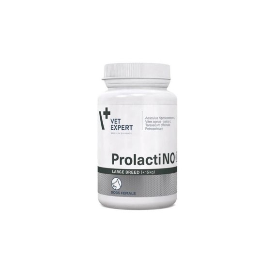 ProlactiNO to unikalny preparat wspomagający dla suk dużych ras, które wykazują objawy typowe dla tzw. ciąży urojonej. Produkt oparty jest wyłącznie na naturalnych składnikach roślinnych, a jego głównym mechanizmem działania jest hamowanie prolaktyny, hormonu odpowiedzialnego za stymulację laktacji. Dzięki temu preparat skutecznie ogranicza objawy kliniczne ciąży urojonej, takie jak powiększenie gruczołów mlekowych, zachowania matczyne czy przybieranie na wadze.