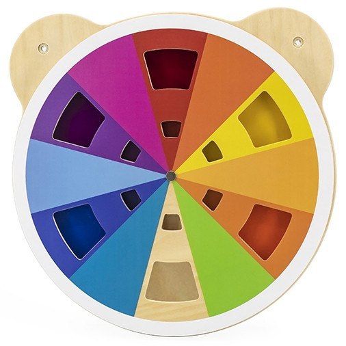 Tablica z akrylową tarczą w różnych odcieniach od marki Viga. Dziecko dzięki obracaniu tarczy tablicy może mieszać kolory w dowolny sposób i odkrywać jakie inne barwy powstają. W sumie można uzyskać aż 60 różnych kolorów. Produkt idealnie sprawdzi się zarówno w domowym zaciszu, szkole oraz przedszkolu. Ciekawe przygotowanie formy tablicy z pewnością przykuje uwagę każdego malucha. Całość wykonana została z drewna lakierowanego i pomalowana nietoksycznymi farbami w żywe barwy, które zadowolą każdego użytkownika i dadzą mnóstwo radości z zabawy. Produkt przeznaczony dla dzieci od 18 miesiąca życia.