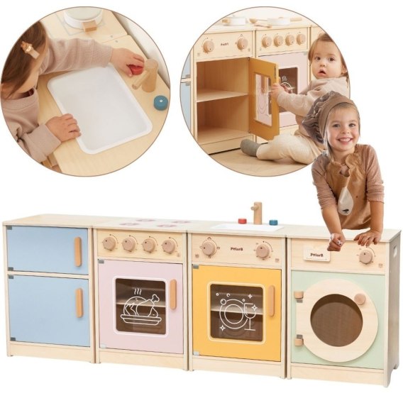Duży drewniany zestaw kuchenny dla maluchów od marki Viga to specjalnie zaprojektowany zestaw, który dostarczy twojemu dziecku niezapomniane chwile zabawy! W skład zestawu wchodzą lodówka, kuchenka z piekarnikiem, zlew, zmywarka oraz pralka. Grube uchwyty ułatwiają otwieranie i zamykanie drzwi, a wszystkie pokrętła wydają dźwięk kliknięcia podczas obracania. Piękne pastelowe kolory przyciągają uwagę dziecka jednocześnie stanowiąc uroczą ozdobę do pokoju. Zestaw jest w pełni bezpieczny dla najmłodszych, nie posiada ostrych krawędzi ani kantów. Zabawkowa kuchnia to dla dzieci ośrodek twórczej zabawy, który rozwija wyobraźnię, umiejętności współpracy i motorykę. Maluch może odgrywać sceny z życia dorosłych, przygotowywać posiłki dla bliskich i ćwiczyć samodzielność. To świetny sposób na interaktywne uczenie dzieci o jedzeniu, gotowaniu, liczeniu, kolorach i kształtach. Dodatkowo, zabawka ta może rosnąć wraz z dzieckiem, a różne akcesoria pozwalają na urozmaicenie zabawy!