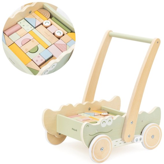 ✔️ Bezpieczny i stabilny - solidna drewniana konstrukcja zapewnia pewne podparcie dla małych nóżek. ✔️Wygodny uchwyt - idealnie dopasowany do małych rączek, pomaga w utrzymaniu równowagi. ✔️ Kolorowe klocki w zestawie - różnorodne kształty i pastelowe barwy zachęcają do kreatywnej zabawy. ✔️Ciche, gumowe kółka - bezpieczne dla podłóg, zapewniają płynną i komfortową jazdę. ✔️Uroczy design krokodyla - pastelowe kolory i zabawna forma sprawią, że maluch go pokocha!
