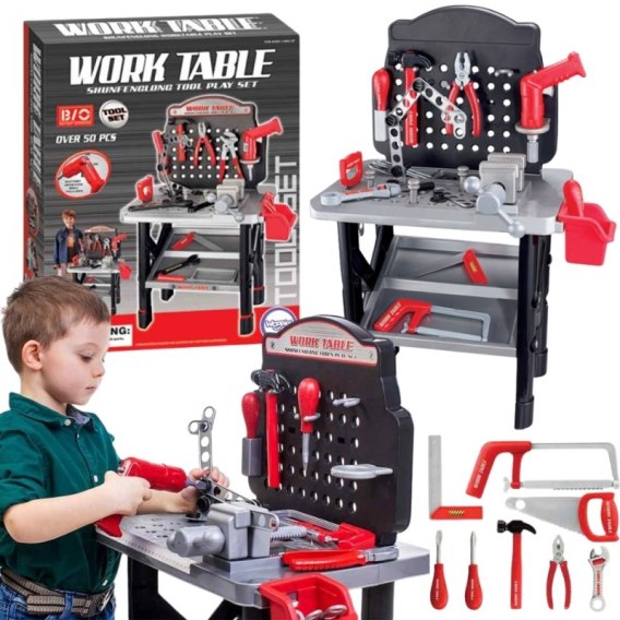 Bogato wyposażony Stół Warsztatowy marki WOOPIE jest idealny dla każdego małego mechanika! Pozwala od małego uczyć się jak używać narzędzi budowlanych oraz zasad ich działania. Warsztat zapewni dziecku doskonałą zabawę, ucząc jednocześnie samodzielności i porządku. Solidne wykonanie i materiały bezpieczne dla dziecka. Zabawka rozwija kreatywność i pobudza wyobraźnię malucha oraz kształtuje jego zdolności motoryczne. W zestawie znajdują się niezbędne każdemu małemu majsterkowiczowi narzędzia - między innymi wiertarkę na baterie, młotek, piłę, imadło, śrubokręt, śrubki oraz inne elementy. W skład zestawu wchodzi aż 50 elementów!