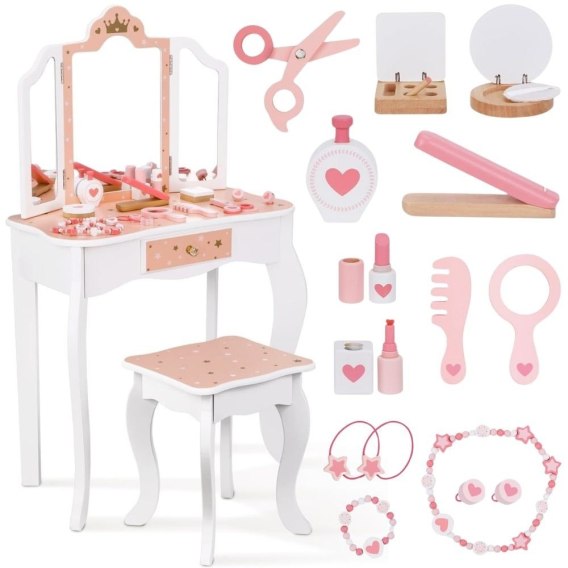 Drewniana toaletka z akcesoriami dla dzieci od Woopie Green to niezwykle urocza i dopracowana w każdym szczególe zabawka, która przenosi dzieci w świat wyobraźni, piękna i kreatywnej zabawy. Zaprojektowana z myślą o najmłodszych miłośniczkach stylu i estetyki, stanowi nie tylko piękny mebel do pokoju, ale również narzędzie wspierające rozwój emocjonalny, społeczny i manualny dziecka. Toaletka zachwyca eleganckim designem inspirowanym klasycznymi meblami dorosłych - ma kształt delikatnego biureczka z potrójnym lustrem, szufladką na drobiazgi i wygodnym stołeczkiem dopasowanym do wzrostu dziecka. Całość wykonana jest z wysokiej jakości drewna, pomalowanego bezpiecznymi, nietoksycznymi farbami w pastelowych odcieniach różu, bieli i złota. Każdy element został starannie oszlifowany, aby zapewnić bezpieczeństwo podczas zabawy. Zdobienia w postaci korony, serduszek i gwiazdek nadają toaletce bajkowego charakteru, sprawiając, że dziecko może poczuć się jak prawdziwa księżniczka lub artystka przygotowująca się do występu. Jej stylowy wygląd doskonale komponuje się z wystrojem dziecięcego pokoju - stanowi zarówno zabawkę, jak i elegancki element dekoracyjny. Toaletka wyposażona jest w praktyczną szufladkę, w której dziecko może przechowywać swoje skarby, biżuterię, akcesoria do włosów i kosmetyki do zabawy. Trzyczęściowe lustro z ruchomymi skrzydłami umożliwia przeglądanie się z różnych stron, a szeroki blat zapewnia dużo miejsca na wszystkie niezbędne dodatki. W zestawie znajduje się również bogaty komplet akcesoriów, dzięki którym zabawa staje się jeszcze bardziej realistyczna - wśród nich lusterko, grzebień, suszarka, cienie, lakier, pomadka, puder czy nawet drewniane perfumy. Dziecko może tworzyć własne stylizacje, ucząc się przy tym dokładności, cierpliwości i samodzielności.