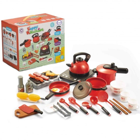 Zabawkowe przybory kuchenne od marki WOOPIE do zabawy w gotowanie, dom i restaurację. Są idealnie odwzorowane, dlatego imitują prawdziwe garnki. Dzięki nim dziecko może przyrządzić obiad dla swoich lalek czy misiów. W jego skład wchodzą: garnek, czajnik, patelnia, talerze, sztućce, noże do krojenia, deska do krojenia, płyta indukcyjną, grill, oraz wiele innych przydatnych akcesoriów. Zestaw akcesoriów kuchennych umożliwia interesującą zabawę w dom, bar, restaurację. Zestaw znakomicie nadaje się do samodzielnej zabawy oraz z dorosłymi lub z innymi dziećmi. Zestaw garnków będzie doskonałym pomysłem na prezent, zarówno dla dziewczynek, jak i chłopców. Żywe i soczyste kolory przyciągną uwagę dziecka i zachęcą do zabawy.