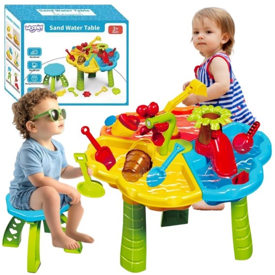 Stolik Wodny 2w1 z krzesełkiem od marki Woopie to wszechstronny zestaw do zabawy wodą i piaskiem, który został zaprojektowany z myślą o potrzebach najmłodszych odkrywców. Idealnie sprawdzi się zarówno w domu, na balkonie, tarasie, jak i w ogrodzie czy na plaży. Zabawka rozwija kreatywność, wyobraźnię i zdolności manualne, zapewniając godziny pełne uśmiechu i nauki. Dzięki bogatemu wyposażeniu oraz solidnemu wykonaniu, ten kolorowy zestaw sprawdzi się zarówno w ogrodzie, jak i w pokoju dziecięcym. Wykonana z bezpiecznego, wytrzymałego i łatwego do utrzymania w czystości tworzywa, pozbawionego ostrych krawędzi jest całkowicie bezpieczna dla maluchów. Trójdzielna konstrukcja stolika pozwala dzieciom jednocześnie eksperymentować z różnymi strukturami i materiałami - piaskiem, wodą i akcesoriami z zestawu. Każdy z elementów zestawu został zaprojektowany tak, by pobudzać dziecięcą wyobraźnię - znajdziemy tu minikoparkę, lejek-drzewko, wiatraczek wodny, foremki do piasku, stateczek, łopatki i wiele innych kolorowych akcesoriów. Dzięki temu dziecko może odgrywać scenki, tworzyć piaskowe kształty, przelewać wodę, budować i eksperymentować - ucząc się przez zabawę. W zestawie znajduje się również kolorowe i ergonomiczne krzesełko, które zapewnia wygodę podczas zabawy. Całość jest łatwa do złożenia i rozłożenia, co czyni ją doskonałym rozwiązaniem zarówno na co dzień, jak i w podróży. Zabawka nie wymaga użycia narzędzi - wszystko łączy się intuicyjnie i stabilnie. Stolik to nie tylko miejsce do zabawy, ale także narzędzie do nauki - wspiera rozwój motoryki, koordynacji wzrokowo-ruchowej, zdolności manualnych, logicznego myślenia, a także komunikacji i umiejętności społecznych, szczególnie podczas zabawy z rówieśnikami. To idealna zabawka na wspólne, radosne chwile, które jednocześnie rozwijają i uczą.