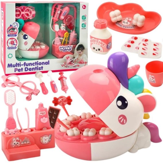 Zestaw małego dentysty głowa jednorożca to wyjątkowa zabawka edukacyjna, która wprowadza dzieci w świat medycyny i dbania o zdrowie jamy ustnej w sposób pełen radości i fantazji Dzięki temu zestawowi maluch może wcielić się w rolę małego dentysty, przeprowadzać badania, leczyć ząbki pacjenta i uczyć się podstaw higieny w zabawny oraz bezpieczny sposób. Realistyczny kształt zębów i przyjazny wygląd kolorowego jednorożca sprawiają, że dziecko z zaciekawieniem odkrywa każdy element zabawy. Otwierana paszcza z zestawem zębów pozwala na symulację prawdziwego badania dentystycznego - maluch może zaglądać do środka, używać narzędzi i przeprowadzać „leczenie". W zestawie znajduje się wszystko, co potrzebne do małej kliniki dentystycznej: lusterko, szczypce, strzykawka, szczoteczka do zębów, a także stetoskop z efektami świetlnymi i dźwiękowymi. Dziecko może wcielać się w rolę lekarza, pacjenta lub asystenta - dzięki czemu zabawa staje się dynamiczna, angażująca i pełna emocji. Zestaw został zaprojektowany tak, aby nie tylko bawić, ale i uczyć. Dziecko poznaje budowę jamy ustnej, dowiaduje się, dlaczego mycie zębów jest tak ważne, oraz jak unikać próchnicy. Zabawka pomaga także w oswojeniu lęku przed wizytą u dentysty, dzięki czemu późniejsze spotkania z prawdziwym lekarzem przebiegają spokojniej. Wszystkie elementy zostały wykonane z trwałych, bezpiecznych dla dzieci materiałów o gładkich, zaokrąglonych krawędziach. Całość utrzymana jest w estetycznej pastelowej kolorystyce, która przyciąga wzrok i zachęca do zabawy. Zestaw jest bogaty w detale i pozwala dziecku poczuć się jak prawdziwy dentysta. Wszystkie elementy są lekkie, łatwe do uchwycenia przez małe rączki i starannie dopasowane do wieku dziecka. Świetnie sprawdzi się zarówno w domu, jak i w przedszkolu jako pomoc edukacyjna.