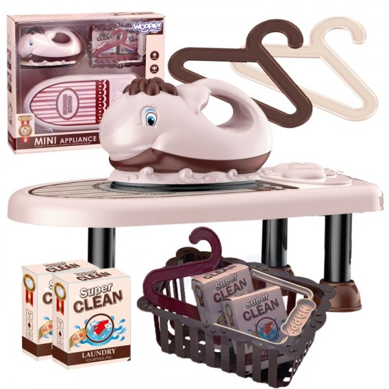 Zestaw do Prasowania od marki WOOPIE dostarczy dziecku mnóstwo zabawy w małą gospodynię domową. W zestawie znajdziemy żelazko w kształcie wielorybka, deskę do prasowania, kosz na pranie, dwa wieszaki oraz dwa opakowania proszku na pranie. Żelazko jest zabawką bezpieczną dla dzieci, ponieważ nie nagrzewa się. Zostało ono wyposażona wwiele funkcji, które urozmaicą zabawę: świecącą lampkę LED oraz efekty dźwiękowe. Zabawka działa także bez napełniania wodą. Jest to doskonały zestaw dla dzieci, które uwielbiają naśladować rodziców podczas codziennych czynności.
