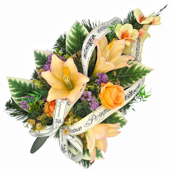 Wiązankę cechuje gęsty splot sztucznych gałązek iglastych, które tworzą estetycznie wyglądające tło dla unikalnej kompozycji sztucznych kwiatów. Starannie dobrane kwiaty są niezwykle realistyczne i naturalne, dodając wiązance autentyczności i podkreślając jej uroczysty charakter.