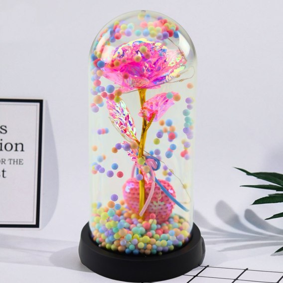 Wieczna kryształowa róża w kolorze różowym z serduszkiem i kolorowymi kuleczkami, umieszczona w eleganckiej kopule z delikatnym oświetleniem LED, to wyjątkowy i symboliczny prezent, który doda niepowtarzalnego charakteru każdemu wnętrzu. Subtelne światło LED tworzy magiczną atmosferę, idealną na romantyczne okazje.