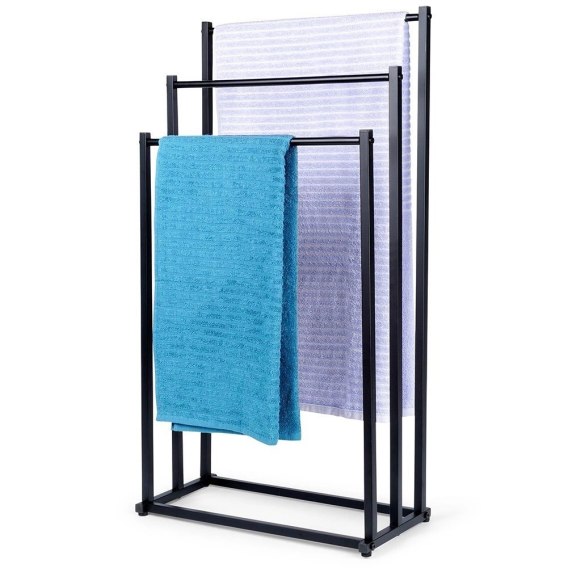 Wolnostojący, metalowy wieszak na ręczniki lub ubrania. Będzie świetnym elementem dekoracyjnym w każdej łazience. Solidna konstrukcja gwarantuje stabilność, umożliwiając wygodne układanie ręczników. Pasuje do każdego wnętrza, zarówno klasycznego, jak i nowoczesnego. Wieszak to niezastąpiony element każdej łazienki, który ułatwi przechowywanie ręczników.