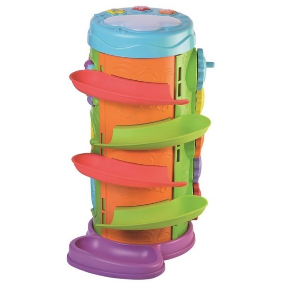 Wysoka wieża skrywa wiele sensorycznych skarbów! Na każdej ze stron znajduje się tu inna zabawa, która pozwoli dziecku ćwiczyć motorykę małą, poznawać zależności przyczynowo - skutkowe i rozwijać zdolności poznawcze. Wśród kolorowych ścianek zabawki pochowało się 5 różnych zabaw: zjeżdżalnia z piłeczkami, trybiki do kręcenia, sorter kształtów z klockami do dopasowania, ruchome elementy do przesuwania i obracania, a także, na samej górze, urocza chmurka z przyciskami aktywującymi melodie i kolorowe, świetlne wzorki.