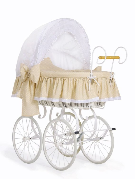 Wiklinowy kosz Mojżesza Retro ze składaną budką Christine - biały + beżowa pościel z koronką