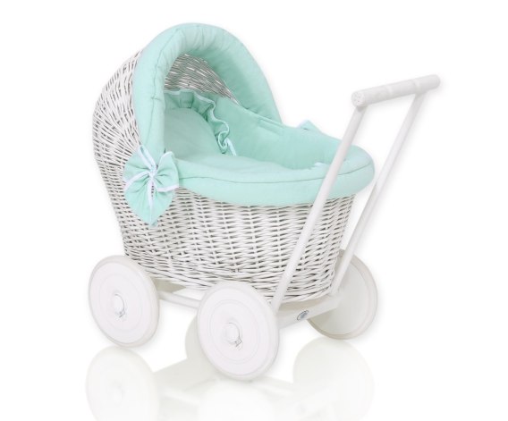 Wiklinowy wózek dla lalek pchacz biały z miętową pościelką i miękką wyściółką
