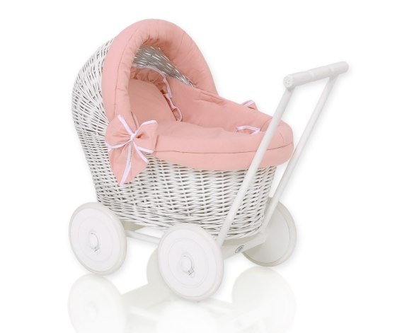 Wiklinowy wózek dla lalek pchacz biały z pościelką i miękką wyściółką brudny róż