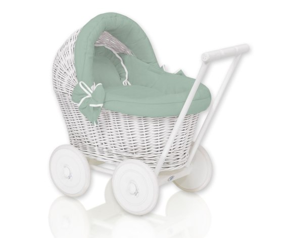 Wiklinowy wózek dla lalek pchacz biały z szałwiową pościelką i miękką wyściółką STELLA