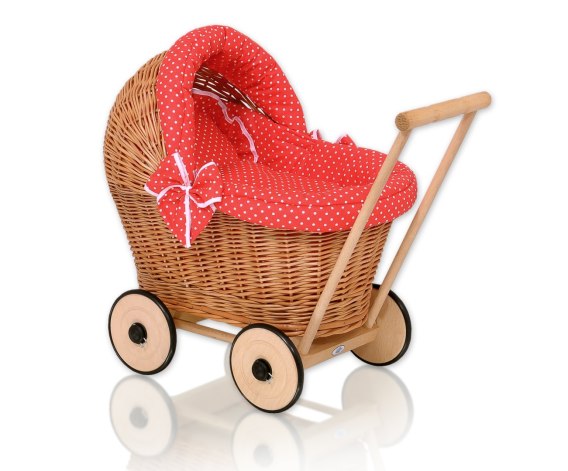 Wiklinowy wózek dla lalek pchacz z czerwoną pościelką i miękką wyściółką- naturalny