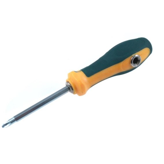 Wkrętak uniwersalny 3 w 1. Dwustronny trzon - krzyżakowy i płaski - można zamontować trzpień na boku trzonka, co daje lepszy moment skręcający.