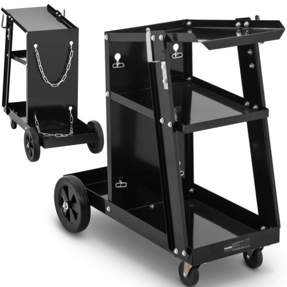 Wózek spawalniczy sprawdzi się do przechowywania sprzętów i narzędzi w branży spawalniczej oraz do ich wygodnego transportu. Wózek posiada 3 półki, jego maksymalna nośność wynosi 80 kg. Posiada także specjalną półkę na butlę z gazem oraz dwa metalowe łańcuchy do utrzymania jej w odpowiedniej pozycji. Po obu stronach umieszczone są uchwyty na przewody.4 kółka zapewniają wózkowi mobilność. Para tylnych kółek o średnicy 190 mm jest wsparciem dla konstrukcji wózka, kółka przednie są mniejsze i skrętne (360 stopni). Konstrukcja sprzętu wykonana została z odpornej, pomalowanej na czarno stali.