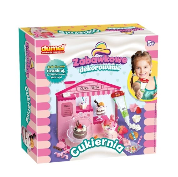 Otwórz własną cukiernię, serwującą zabawkowe desery! Opakowanie zawiera wszystko, czego potrzeba, aby „wyczarować" wiele zabawkowych smakołyków. Poza masą plastyczną, do formowania ciasta, i masą kremową w tubce, do dekorowania, znajdziesz tu też papierową witrynę do wyeksponowania deserów, plastikowe pucharki, paterę oraz wiele kolorowych dodatków, z pomocą których ozdobisz stworzone przez siebie, zabawkowe desery. Po udekorowaniu każdego z nich, pozostaw desery, aby stwardniały, najlepiej na całą dobę.
