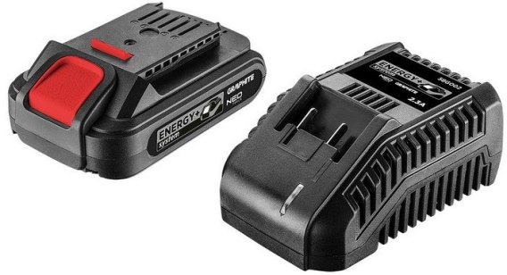 Zestaw Energy+: akumulator 2 Ah z ładowarką 58GE131 marki GRAPHITE składa się na akcesoria w nowoczesnej serii akumulatorowej Energy+. Akumulator o pojemności 2 Ah litowo-jonowy 18 V 58G001 oraz ładowarka 2,3 A 58G002 są kompatybilne ze wszystkimi elektronarzędziami Energy+ GRAPHITE i NEO. Gwarantują ładowanie bez ryzyka utraty pojemności. Posiadają wskaźnik ładowania i elektroniczny system kontroli temperatury oraz przepływu prądu podczas ładowania, a także rozładowywania. Akumulator i ładowarka posiadają certyfikat CE. Sprawdzą się zarówno w warsztacie profesjonalisty jak i majsterkowicza.