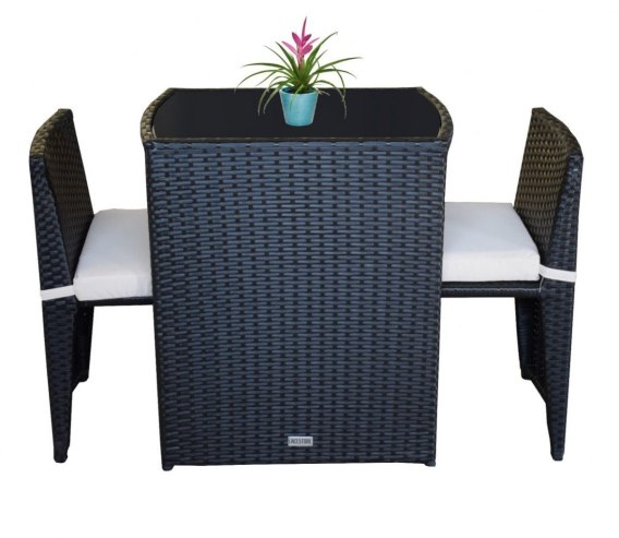 Ten elegancki zestaw mebli w czarnym kolorze został wykonany z wysokiej jakości rattanu syntetycznego - materiału odpornego na szkodliwe działanie warunków atmosferycznych. Zestaw składa się z 2 krzeseł oraz stolika kawowego ze szklanym, czarnym blatem. Ze względu na swoje niewielkie wymiary nasze meble idealnie się sprawdzą na balkonie, tarasie czy ogrodzie. Dodatkową zaletą mebli jest ich kompaktowy wymiar. Krzesła można wsunąć pod stolik przez co cały zestaw zajmuje niewiele miejsca. Krzesła posiadają poduszki w kontrastowym beżowym kolorze dla większego komfortu podczas użytkowania.