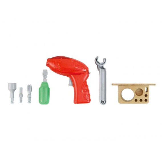 W zestawie ręcznych narzędzi do ścianki Naukowo-Kreatywnej Masterkidz, znajduje się wkrętarka, śrubokręt z 4 wymiennymi końcówkami, klucz, oraz półeczka na narzędzia. Taki zestaw pozwala dziecku na poznanie różnego rodzaju narzędzi, nauczenia się jak ich poprawnie używać, oraz na kreowanie z ich pomocą przepięknych obrazków na tablicy STEM.