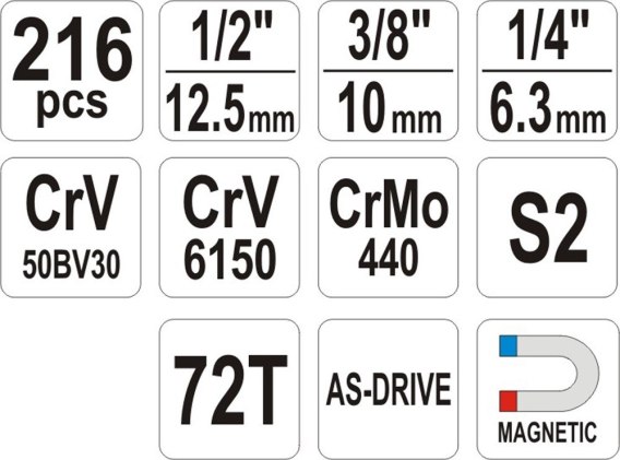 nasadki: 3/8" (9.5 mm): 10, 11, 12, 13, 14, 15, 16 mm (L=28 mm); 17, 18, 19 mm (L=30 mm), 1/4" (6.3 mm): 4, 4.5, 5, 5.5, 6, 7, 8, 9, 10, 11, 12, 13, 14 mm (L=25 mm) |