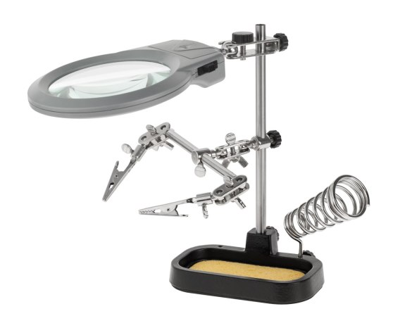Zestaw wyposażony jest w lupę 2D o rozmiarze soczewki 90 mm, która zapewnia powiększenie i ułatwia dokładne oglądanie małych elementów. Dodatkowe oświetlenie w postaci dwóch diod LED gwarantuje dobrą widoczność i oświetlenie miejsca pracy, co jest szczególnie ważne podczas precyzyjnych operacji lutowniczych w słabym świetle. Zasilanie diod LED odbywa się za pomocą trzech baterii AAA (nie znajdują się w zestawie).