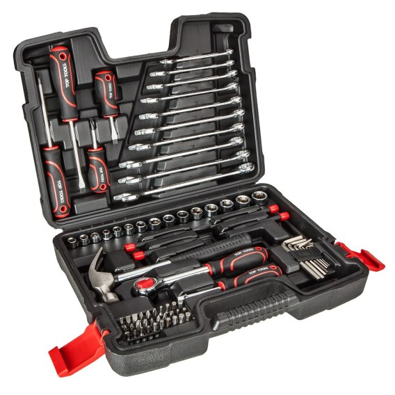 Zestaw narzędziowy , 3/8, 73 szt. Materiał stal węglowa. Grzechotka 3/8, uchwyt wkrętakowy , uchwyt do bitów , młotek stolarski 200 g, wkrętaki precyzyjne 4 szt.: PH00, PH0, SL00, SL0, wkrętaki 190 mm, 2 szt.: PH2, SL6.5, wkrętaki 100 mm 2 szt.: PH2, SL6; klucze płasko-oczkowe 10 szt.: 8, 10, 11, 12, 13, 14, 15, 16, 17, 19 mm; klucze HEX 7 szt.: 1.5, 2, 2.5, 3, 4, 5, 6 mm; nasadki 3/8, 8 szt.: 10, 11, 12, 13, 14, 15, 16, 17 mm; nasadki , 6 szt.: 5, 6, 7, 8, 9, 10 mm; końcówki wkrętakowe 25 mm, 30 szt.: SL3, SL4, SL4.5, SL5, SL5.5, SL6, SL6.5, SL7, SL8, H3, H4, H5, H6, PH0, PH1, PH2, PH3, PZ0, PZ1, PZ2, PZ3, T8, T10, T15, T20, T25, T27, T30, T40, T45.
