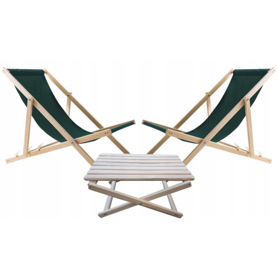 Zestaw dwóch leżaków drewnianych z materiałem w kolorze zielonym + stolik kawowy, będzie doskonałą propozycją do każdego ogrodu lub na plażę. Stolik jak i leżaki składają się, dzięki czemu możesz zestaw zabrać wszędzie ze sobą nawet na wakacje!