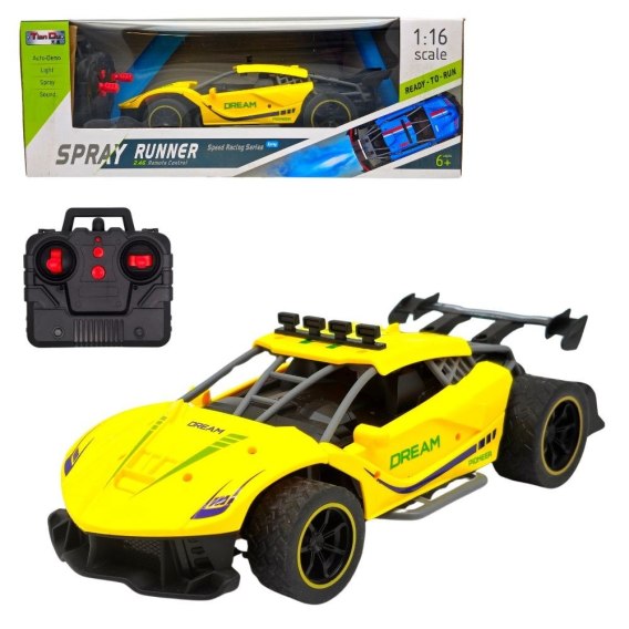 Żółty, sportowy samochód wyścigowy sterowany radiem z efektem dymu
