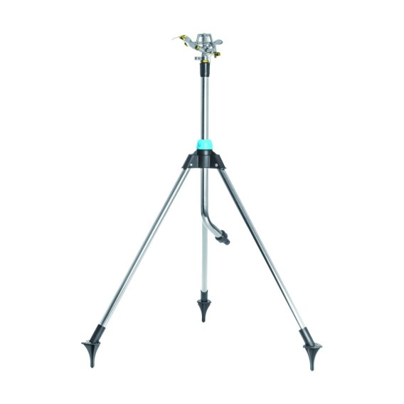 Profesjonalny metalowy zraszacz pulsacyjny na regulowanym trójnogu.